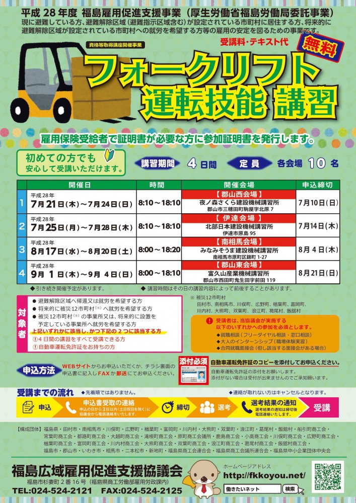 | 【実施機関】 (株)富久山自動車教習所 (富久山産業機械講習所) 【お問合せ】 福島広域雇用促進支援協議会 中町窓口 TEL:024-524-2121 受付時間:平日9:00~12:00/13:00~16:30 | 10名 | 2016/08/21(日) | 受付終了 |