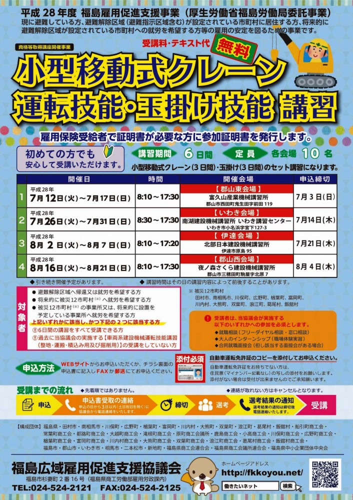 | 【実施機関】 (株)富久山自動車教習所 (富久山産業機械講習所) 【お問合せ】 福島広域雇用促進支援協議会 中町窓口 TEL:024-524-2121 受付時間:平日9:00~12:00/13:00~16:30 | 10名 | 2016/07/03(日) | 受付終了 |