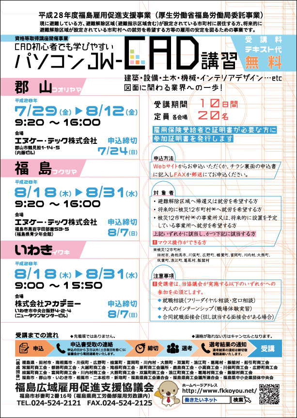 | 【実施機関】 株式会社アカデミー 【お問合せ】 福島広域雇用促進支援協議会 中町窓口 TEL:024-524-2121 受付時間:平日9:00~12:00/13:00~16:30 | 20名 | 2016/08/07(日) | 受付終了 |
