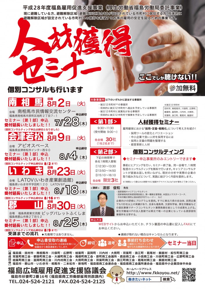 | 福島広域雇用促進支援協議会 中町窓口 TEL:024-524-2121 受付時間:平日9:00~12:00/13:00~16:30 | 30社/3社 | 2016/08/04(木) | 受付終了 |