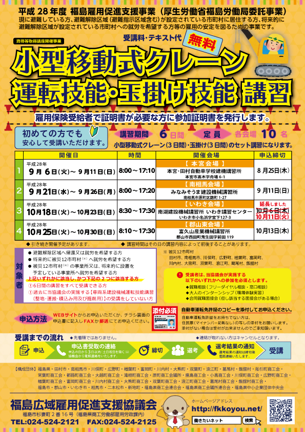 | 【実施機関】 (株)富久山自動車教習所 (富久山産業機械講習所) 【お問合せ】 福島広域雇用促進支援協議会 中町窓口 TEL:024-524-2121 受付時間:平日9:00~12:00/13:00~16:30 | 10名 | 2016/10/13(木) | 受付終了 |