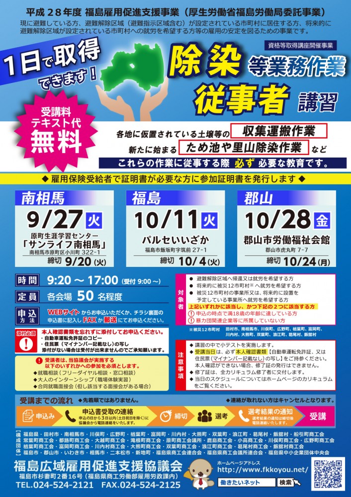 | 福島広域雇用促進支援協議会 中町窓口 〒960-8043 福島市中町4番20号 みんゆうビル202号 TEL:024-524-2121 FAX:024-524-2125 受付時間:平日9:00~12:00/13:00~16:30 | 50名程度 | 2016/10/04(火) | 受付終了 |