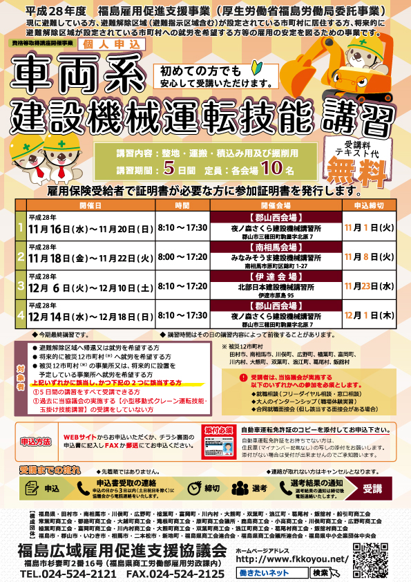 | 【実施機関】 (株)川上工業 (夜ノ森さくら建設機械講習所) 【お問合せ】 福島広域雇用促進支援協議会 中町窓口 TEL:024-524-2121 受付時間:平日9:00~12:00/13:00~16:30 | 10名 | 2016/12/01(木) | 受付終了 |