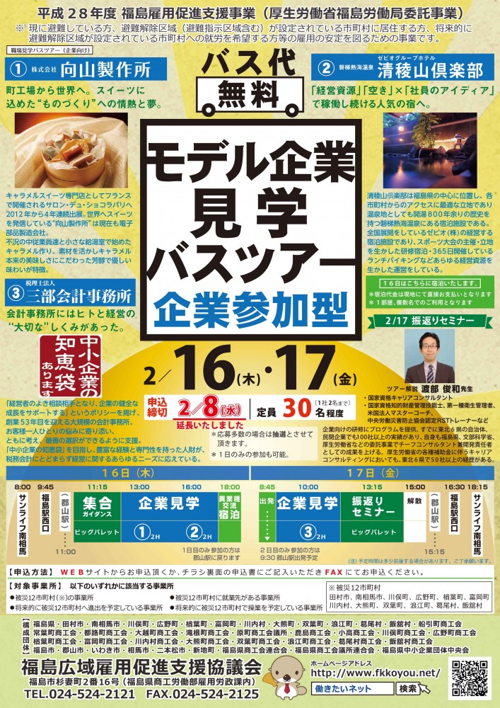 | 1日目のみ | 福島広域雇用促進支援協議会 中町窓口 〒960-8043 福島市中町4番20号 みんゆうビル202号 TEL:024-524-2121 受付時間:平日9:00~12:00/13:00~16:30 | 30名程度 (1社2名まで) | 2017/02/08(水) | 受付終了 |