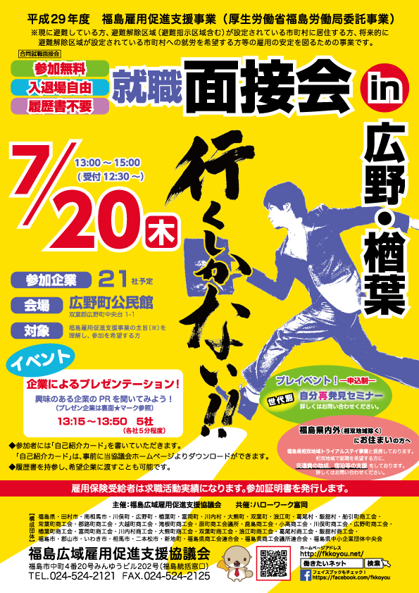 就職面接会in広野・楢葉 13:00~15:00(受付開始12:30~) |
