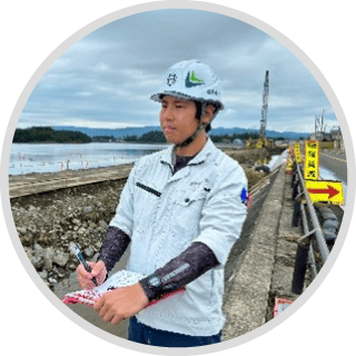 『国家資格を目指す』仕事、『地域に貢献できる』仕事、『体を動かす』仕事がしたいと思っていた為、建設業に就職しようと決めました。建設業について知識がなくても、実際に働いている先輩方から学べる環境がある為、頑張ろうと思いました。現在は二級土木施工管理技士の取得を目指して経験を積んでいます。