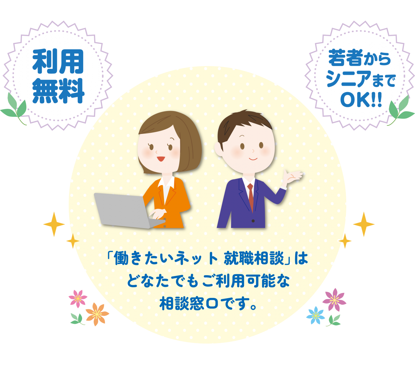 - 就労中の方でも、ご利用できます。現在の仕事の内容や状況、また、就職の希望(職種・時期)などをお聞きし、相談しながら計画的に進めていきましょう。